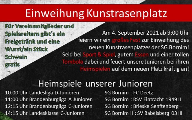 Am 4.09. 2021 ab 09:00 Uhr feiern wir ein großes Fest zur Einweihung des neuen Kunstrasenplatzes.